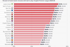 英超20队净比赛时间占比:利兹联居首,纽卡切尔西曼联倒数前三